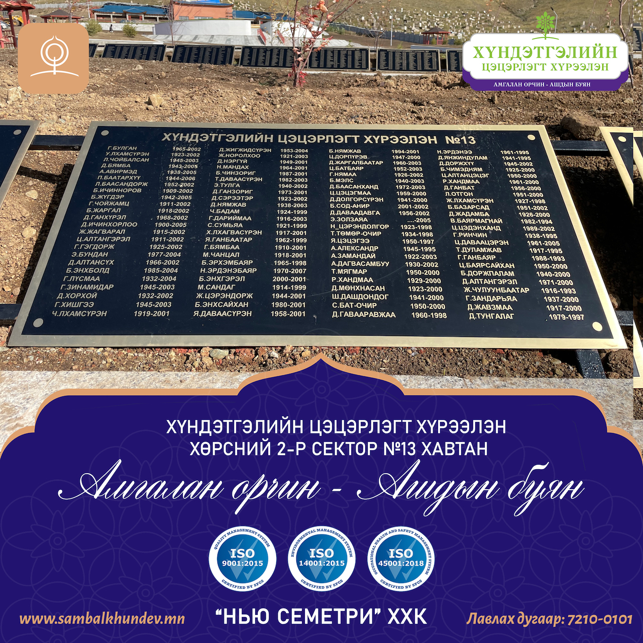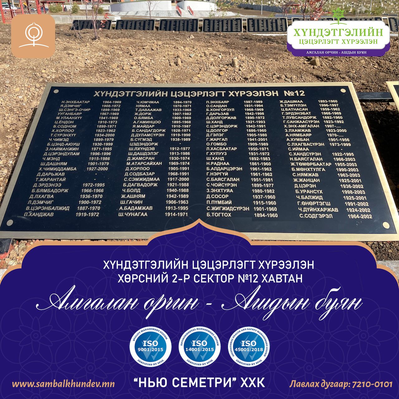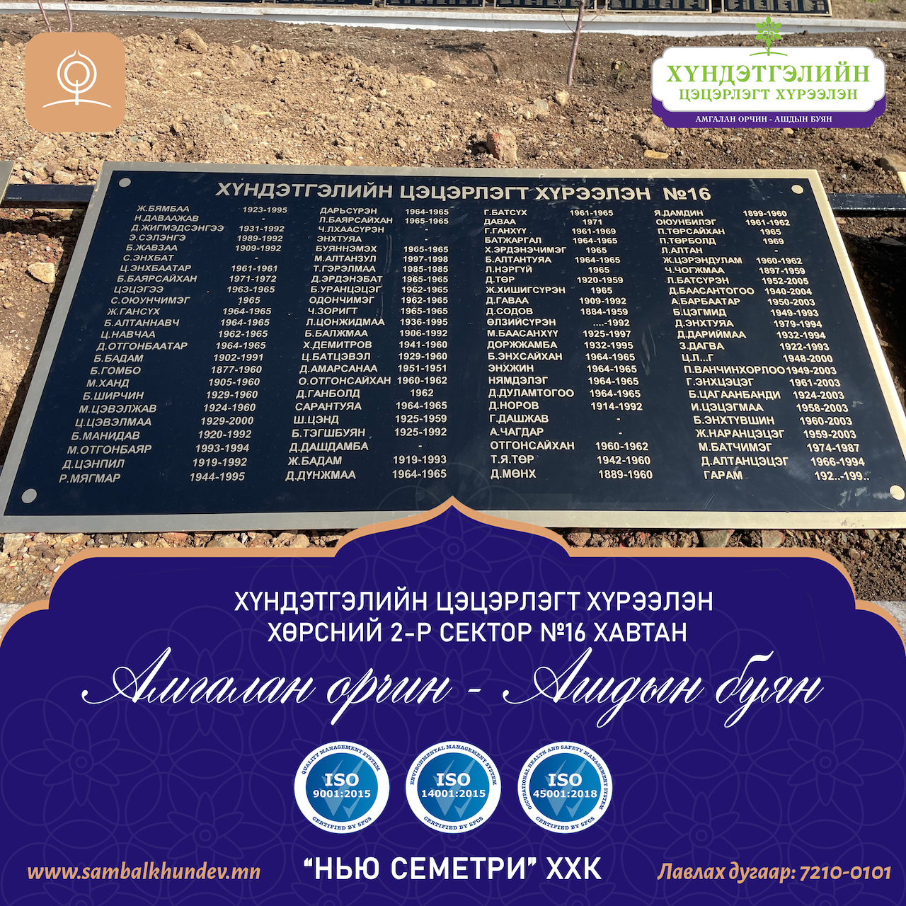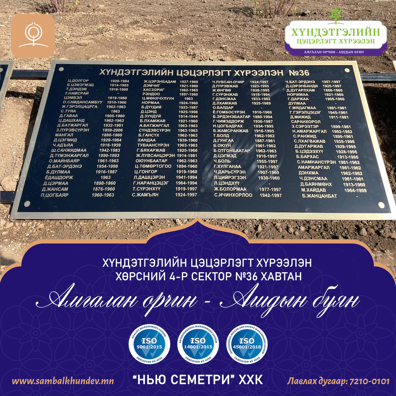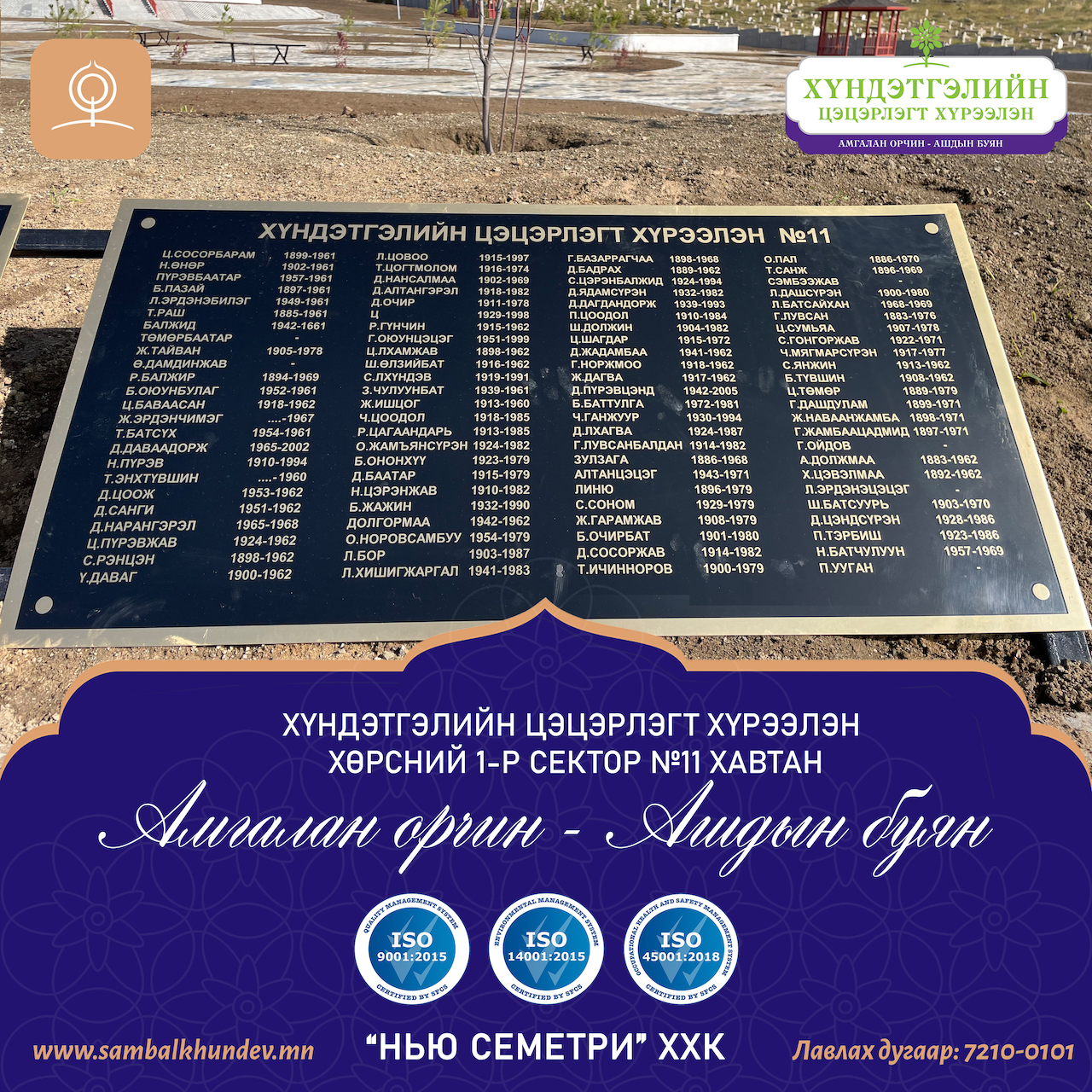 САМБАЛХҮНДЭВ БУЮУ 70 ДАВХРЫН ОРШУУЛГЫН ГАЗАРТ БҮТЭЭН БАЙГУУЛЖ БУЙ ХҮНДЭТГЭЛИЙН ЦЭЦЭРЛЭГТ ХҮРЭЭЛЭНГИЙН ХӨРСНИЙ СЕКТОРТ ХҮНДЭТГЭН ЗАЛСАН БУРХАН БОЛОГСДЫН НЭРСИЙГ БҮРЭН БАЙРЛУУЛЖ ДУУСЛАА.