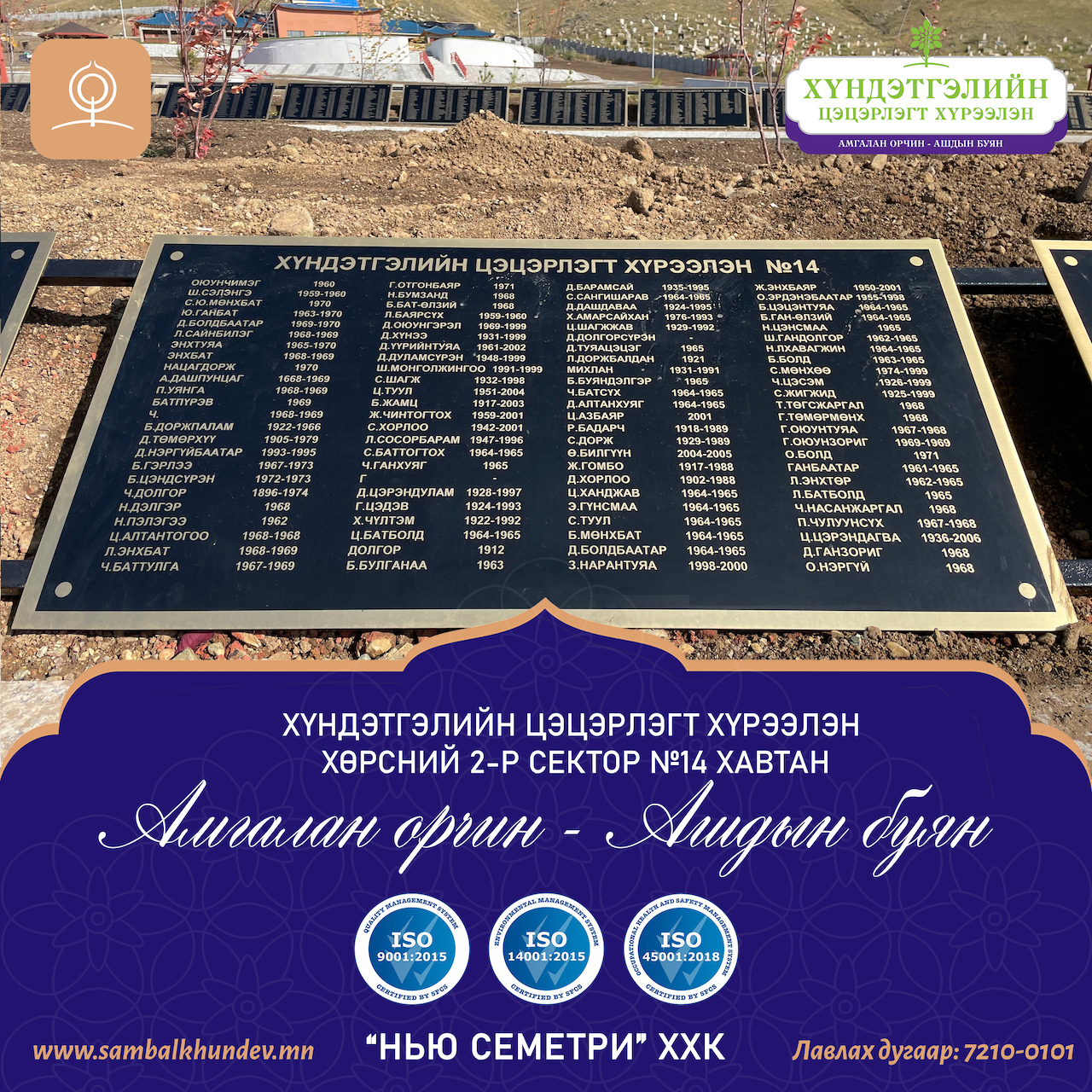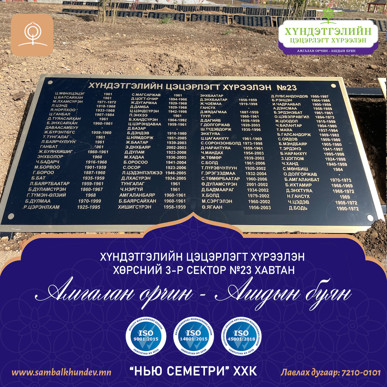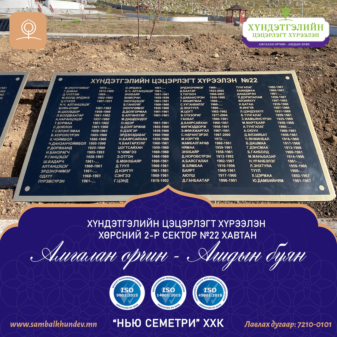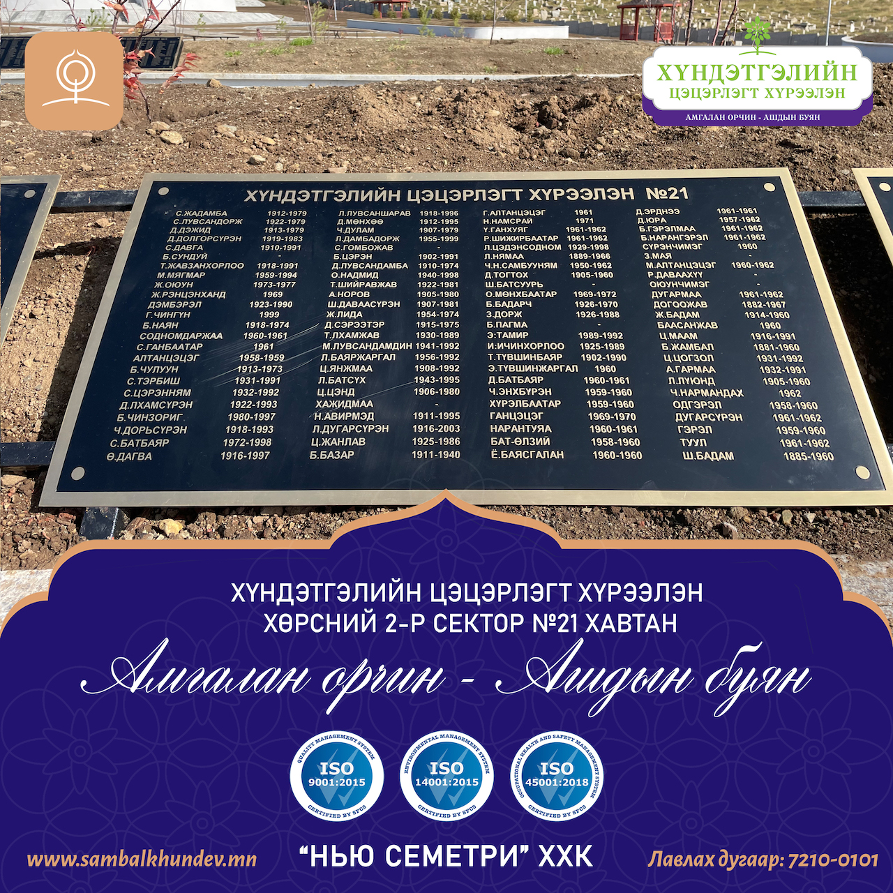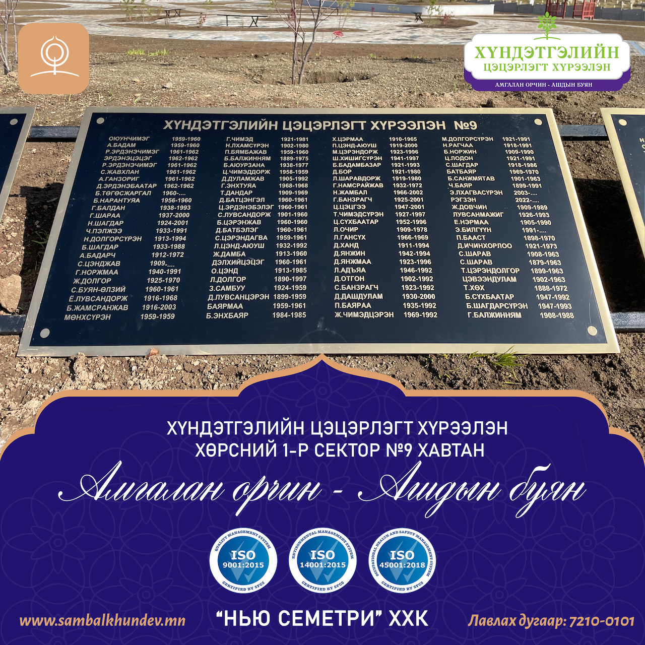 САМБАЛХҮНДЭВ БУЮУ 70 ДАВХРЫН ОРШУУЛГЫН ГАЗАРТ БҮТЭЭН БАЙГУУЛЖ БУЙ ХҮНДЭТГЭЛИЙН ЦЭЦЭРЛЭГТ ХҮРЭЭЛЭНГИЙН ХӨРСНИЙ СЕКТОРТ ХҮНДЭТГЭН ЗАЛСАН БУРХАН БОЛОГСДЫН НЭРСИЙГ БҮРЭН БАЙРЛУУЛЖ ДУУСЛАА.