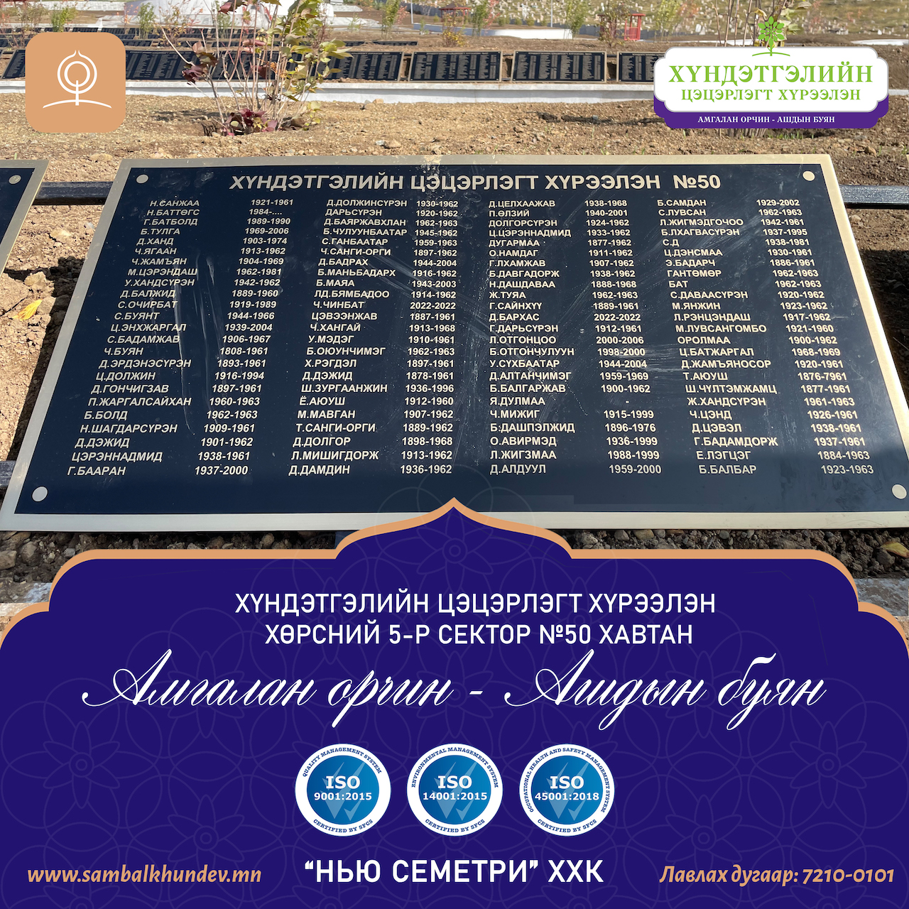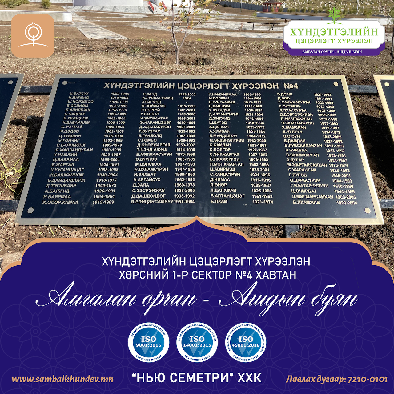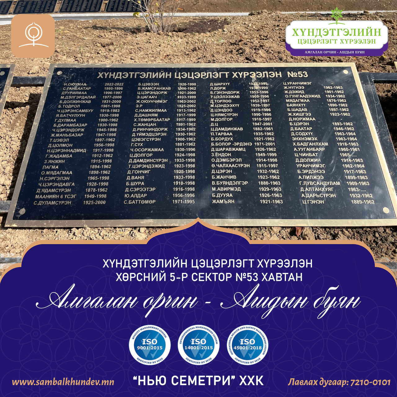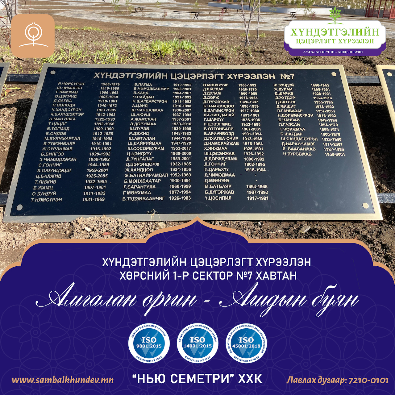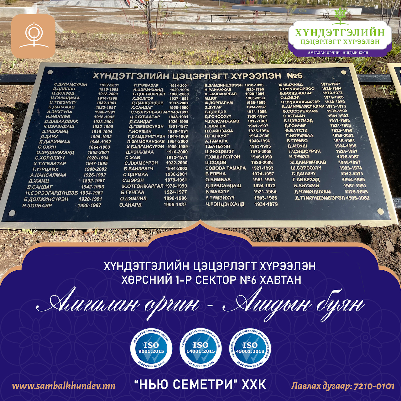 САМБАЛХҮНДЭВ БУЮУ 70 ДАВХРЫН ОРШУУЛГЫН ГАЗАРТ БҮТЭЭН БАЙГУУЛЖ БУЙ ХҮНДЭТГЭЛИЙН ЦЭЦЭРЛЭГТ ХҮРЭЭЛЭНГИЙН ХӨРСНИЙ СЕКТОРТ ХҮНДЭТГЭН ЗАЛСАН БУРХАН БОЛОГСДЫН НЭРСИЙГ БҮРЭН БАЙРЛУУЛЖ ДУУСЛАА.