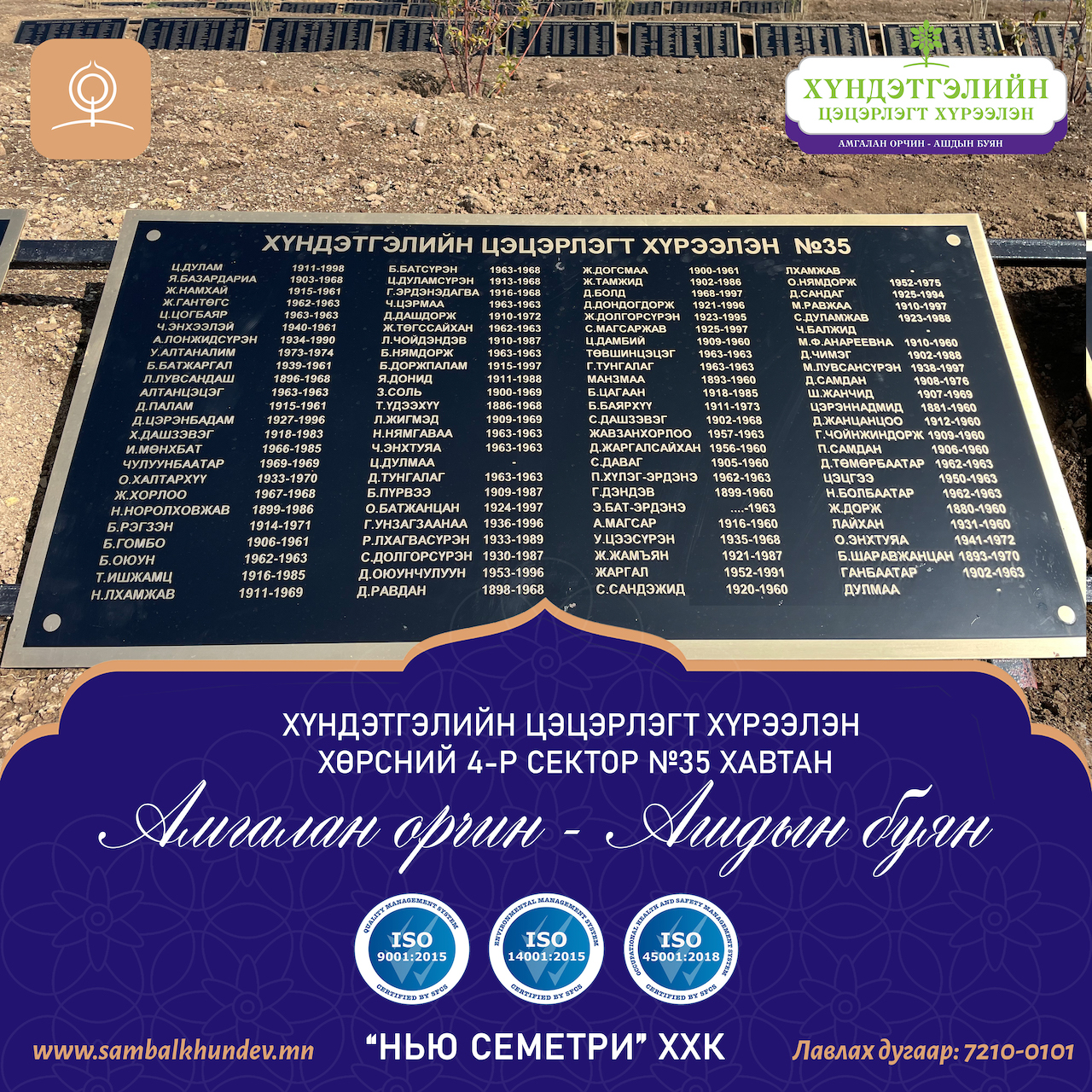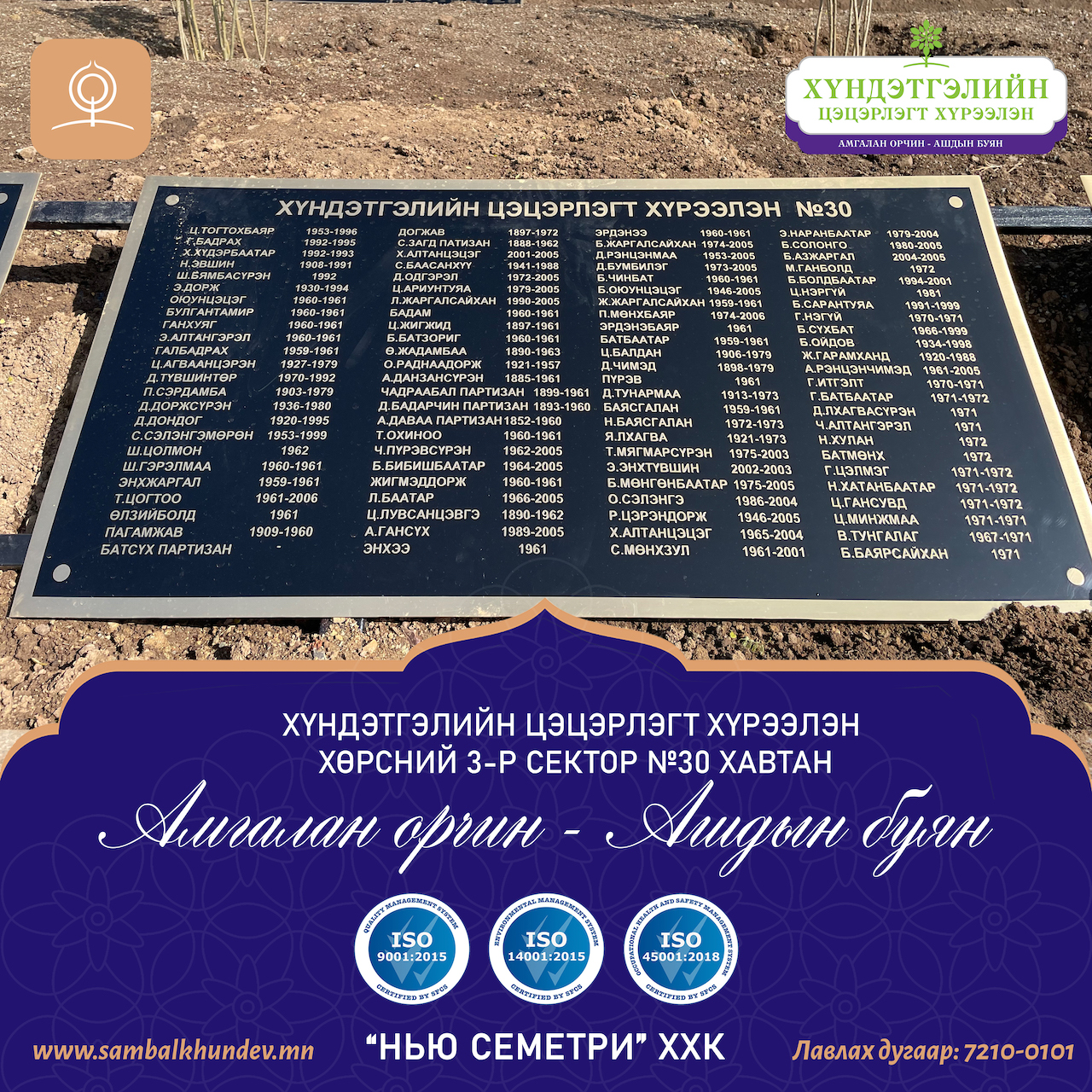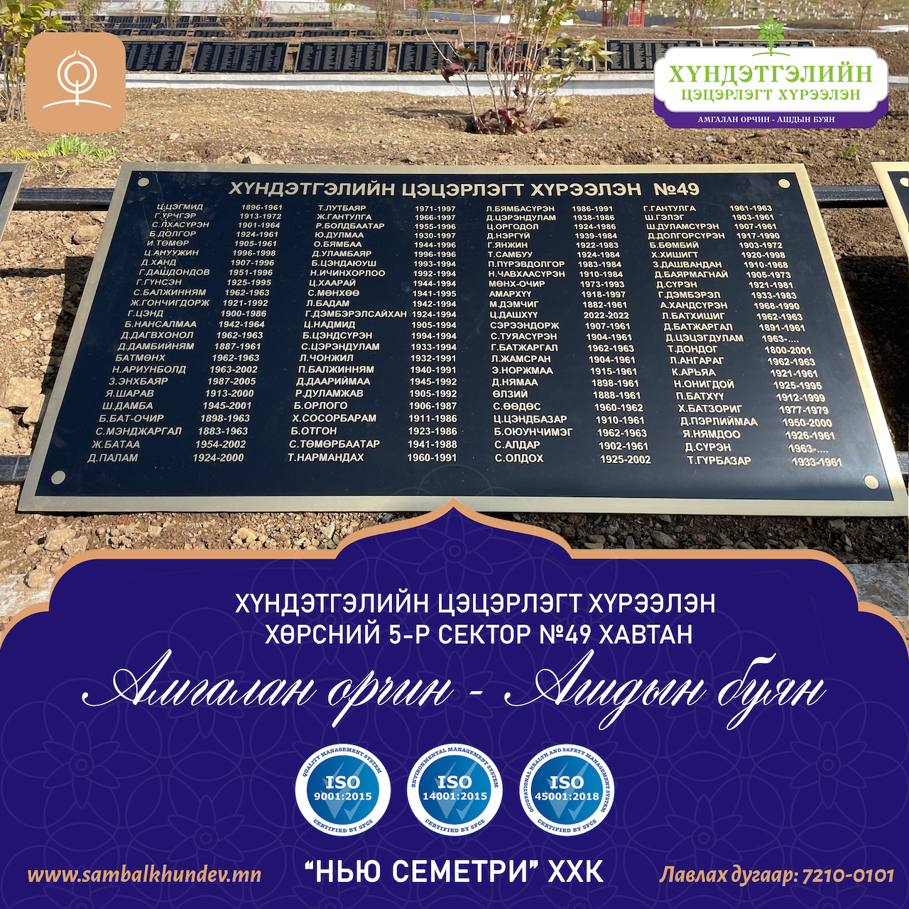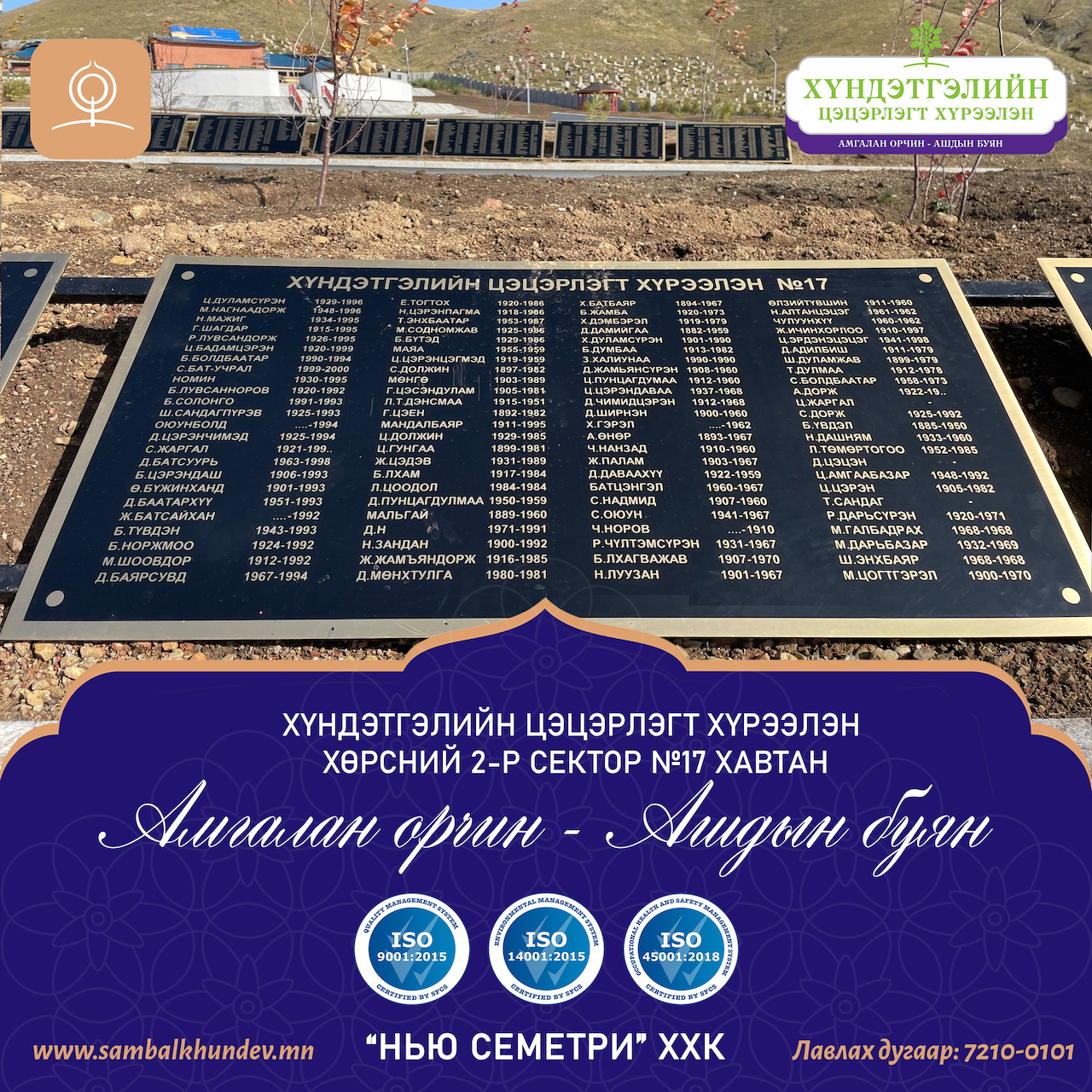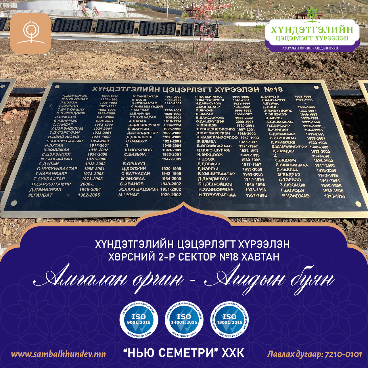 САМБАЛХҮНДЭВ БУЮУ 70 ДАВХРЫН ОРШУУЛГЫН ГАЗАРТ БҮТЭЭН БАЙГУУЛЖ БУЙ ХҮНДЭТГЭЛИЙН ЦЭЦЭРЛЭГТ ХҮРЭЭЛЭНГИЙН ХӨРСНИЙ СЕКТОРТ ХҮНДЭТГЭН ЗАЛСАН БУРХАН БОЛОГСДЫН НЭРСИЙГ БҮРЭН БАЙРЛУУЛЖ ДУУСЛАА.