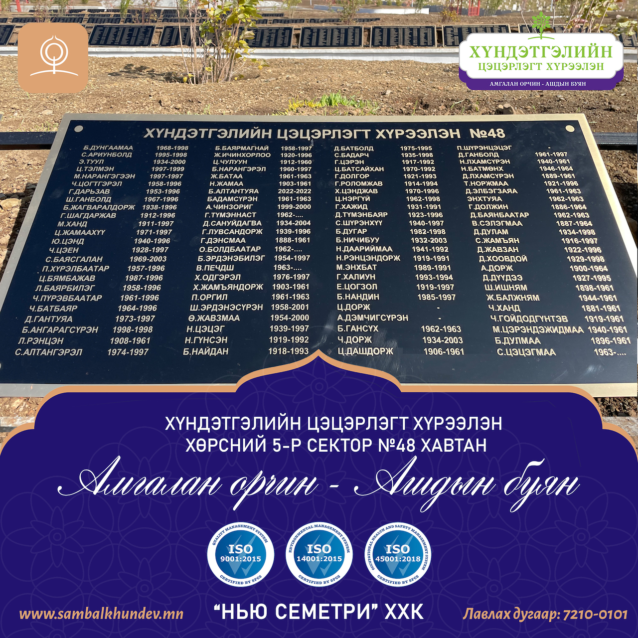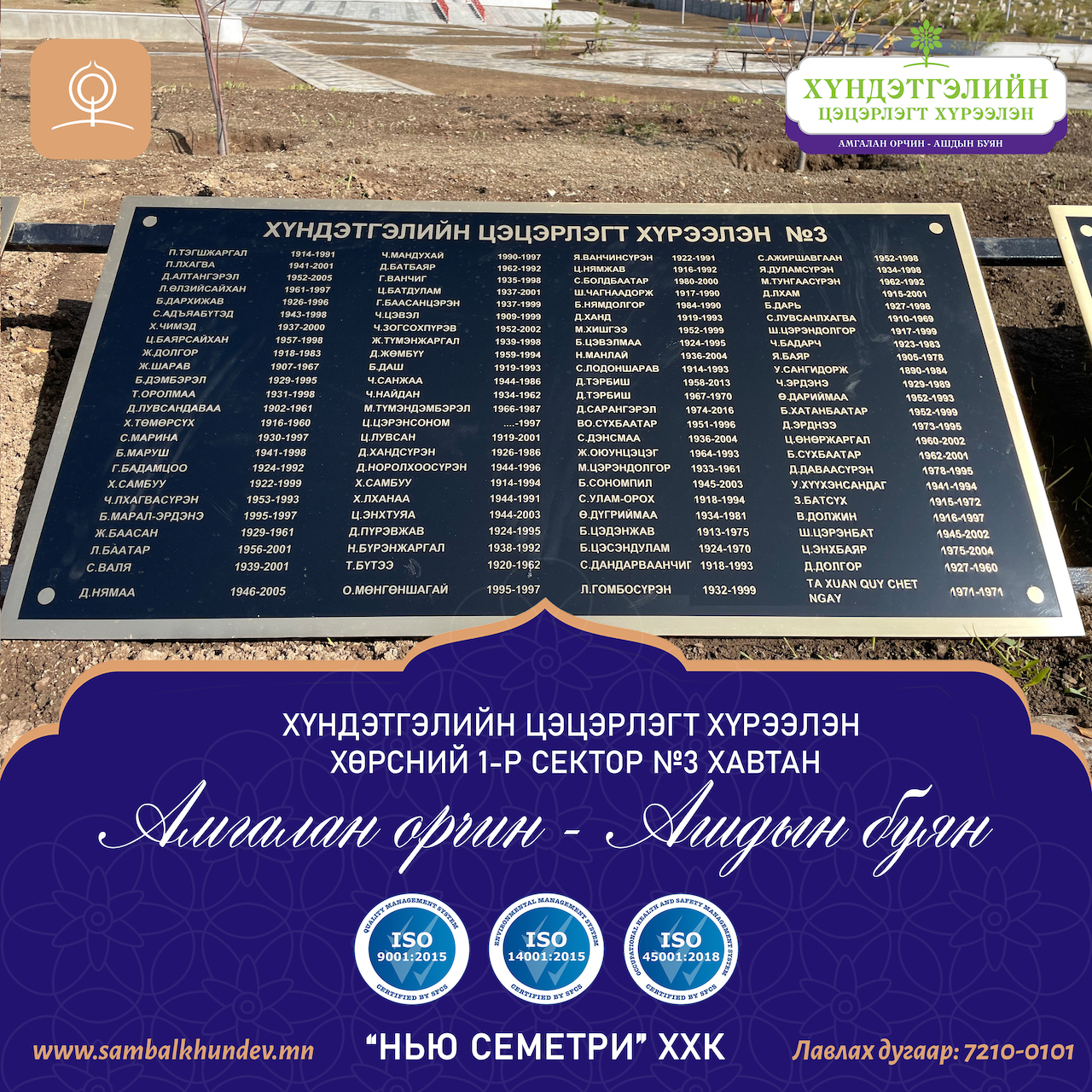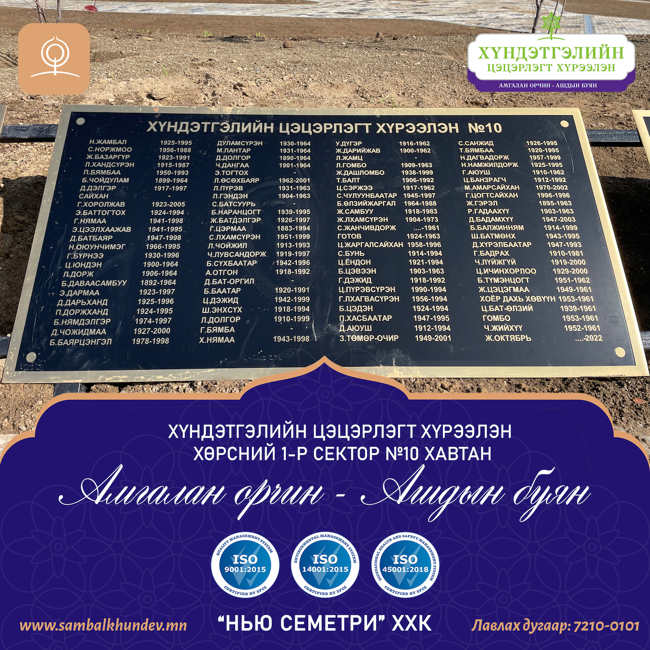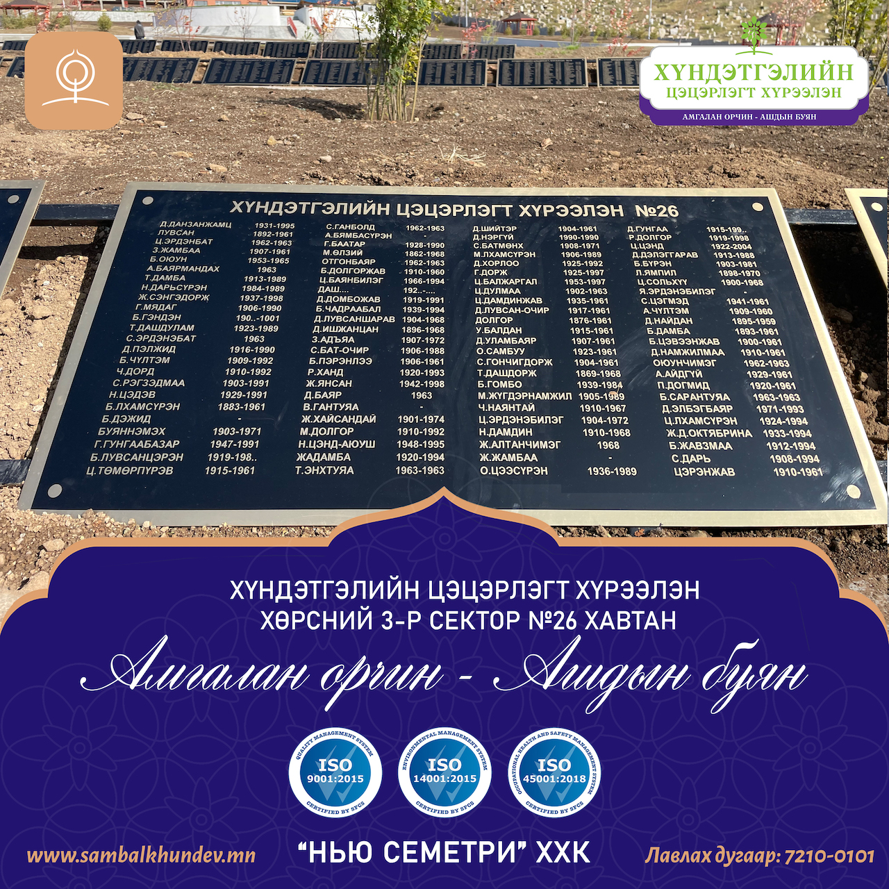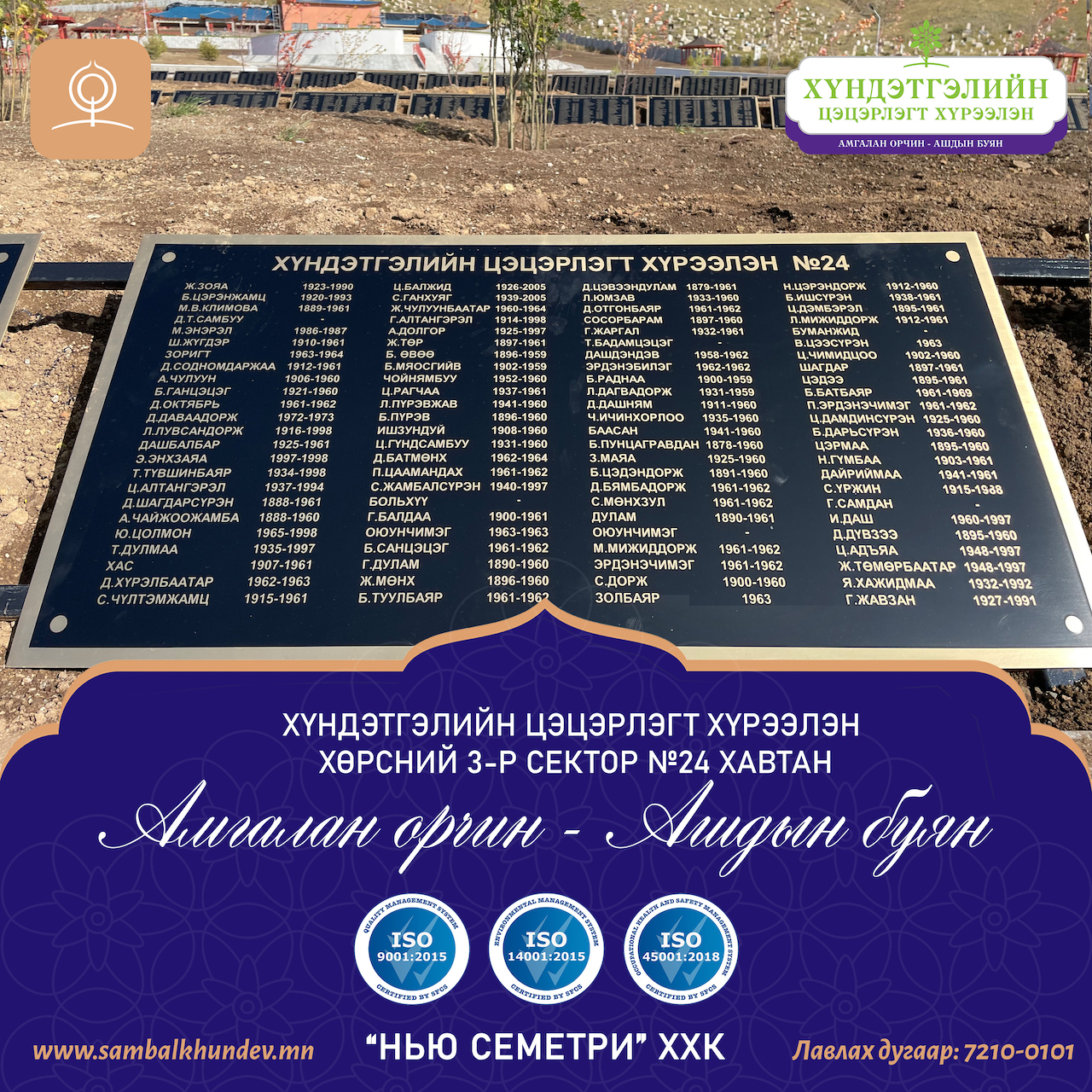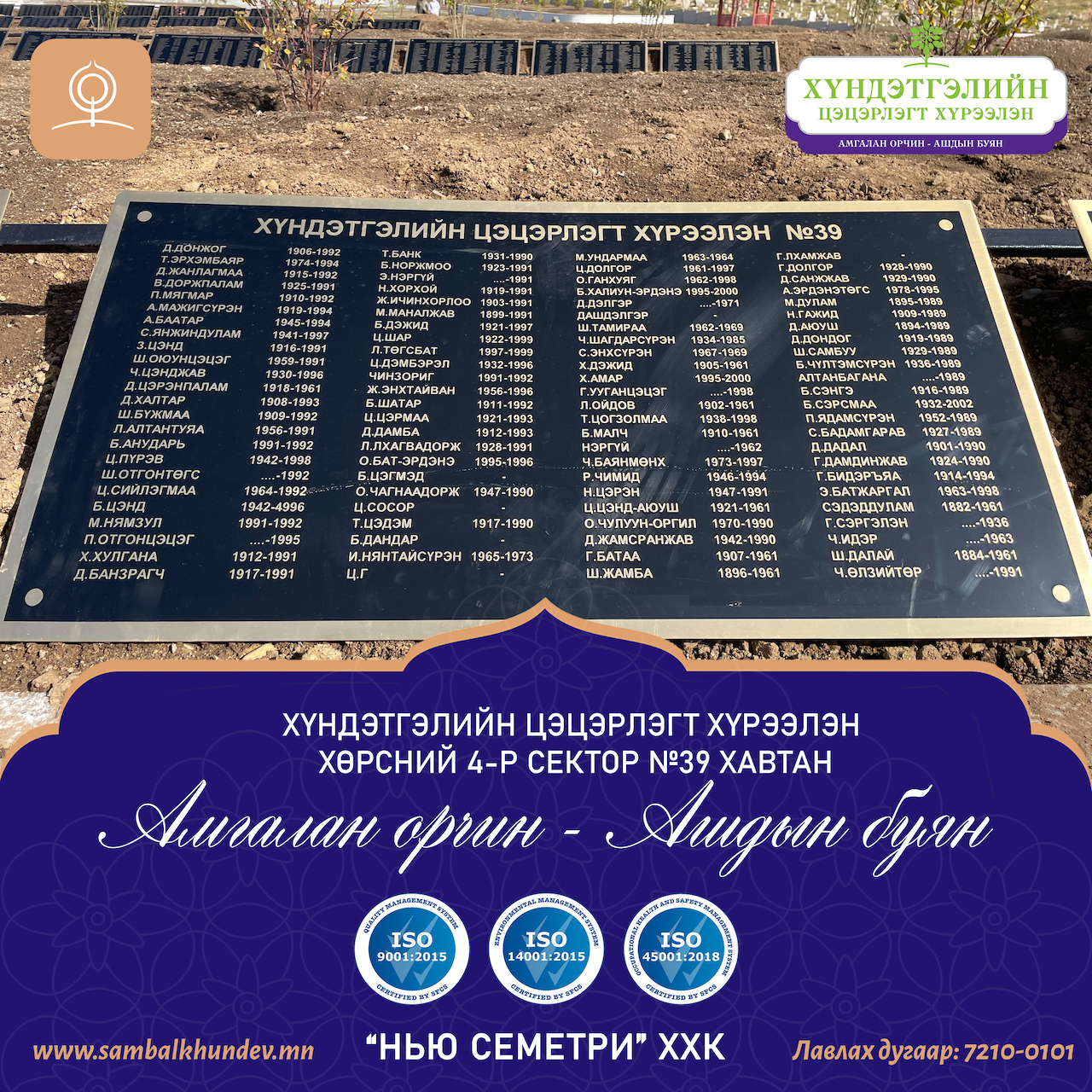 САМБАЛХҮНДЭВ БУЮУ 70 ДАВХРЫН ОРШУУЛГЫН ГАЗАРТ БҮТЭЭН БАЙГУУЛЖ БУЙ ХҮНДЭТГЭЛИЙН ЦЭЦЭРЛЭГТ ХҮРЭЭЛЭНГИЙН ХӨРСНИЙ СЕКТОРТ ХҮНДЭТГЭН ЗАЛСАН БУРХАН БОЛОГСДЫН НЭРСИЙГ БҮРЭН БАЙРЛУУЛЖ ДУУСЛАА.